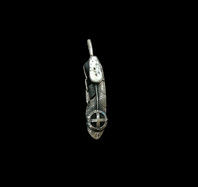 存在感あふれるフェザートップに、希少な ホワイトブァッファローをセット。 エンド部分には メディスンホイール をあしらい、深い意味と力強さを表現しました。 素材には 925シルバー を使用し、確かな重みと輝きを感じられる逸品です。 全長:75mm 重量:14.55g 一点物の存在感とホワイトブァッファローならではの魅力をぜひお手元に。