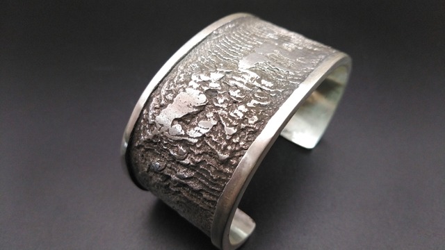 【一点物バングル – Cuttlefish Bone Cast】 伝統技法 Cuttlefish Bone Cast により誕生した唯一無二のバングル。 コウイカの骨に溶かしたシルバーを流し込み、自然が生み出す独特のテクスチャーをそのまま刻み込みました。 素材は贅沢に 950シルバー を使用。 幅10mm厚み3~3,2mm 重量42,9gの細めのバングルですが、腕に確かな存在感を放ちます。 後々、石をセッティングすることでさらなるカスタムも可能。 一点物ならではの迫力と個性をぜひお楽しみください。