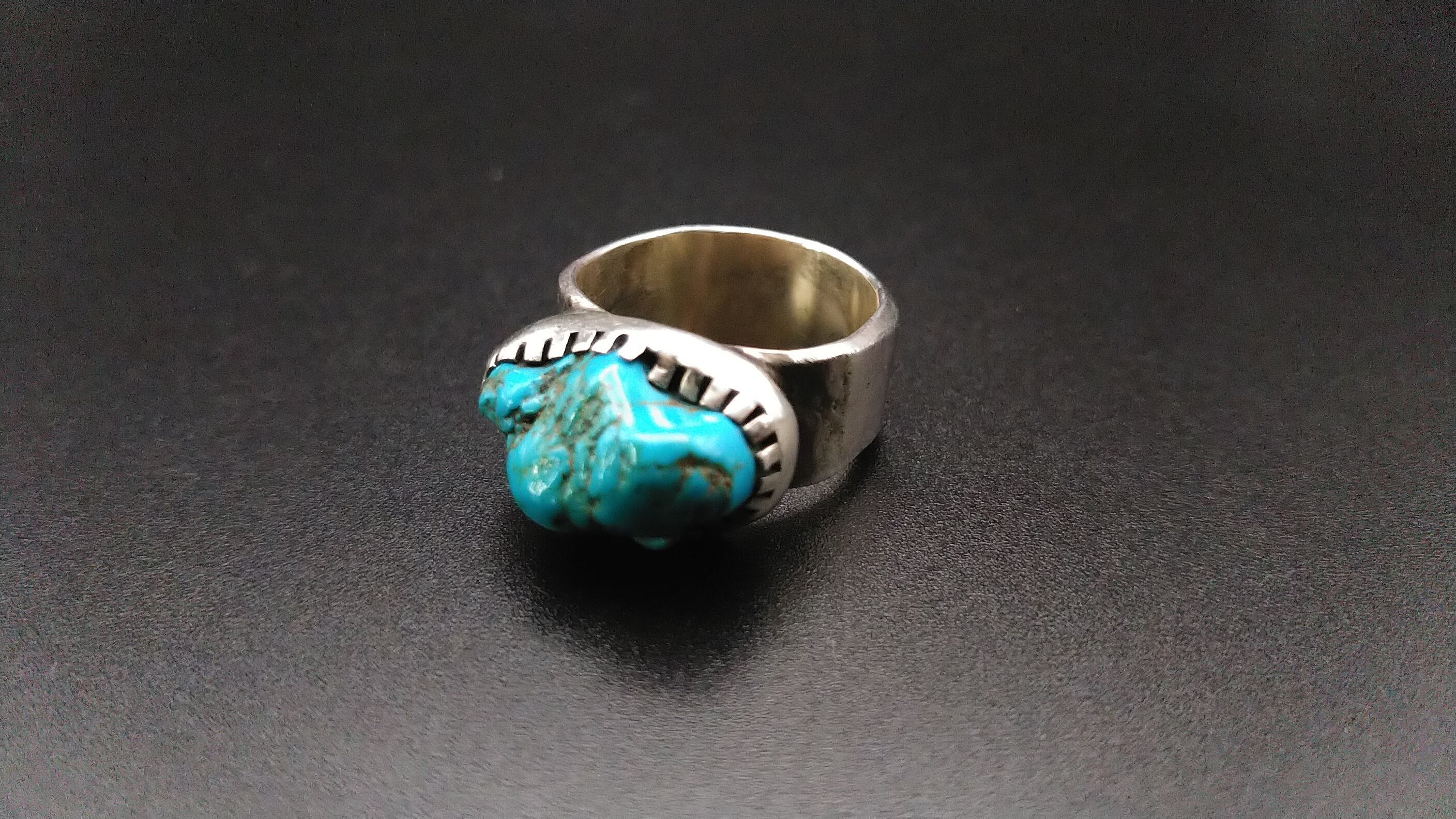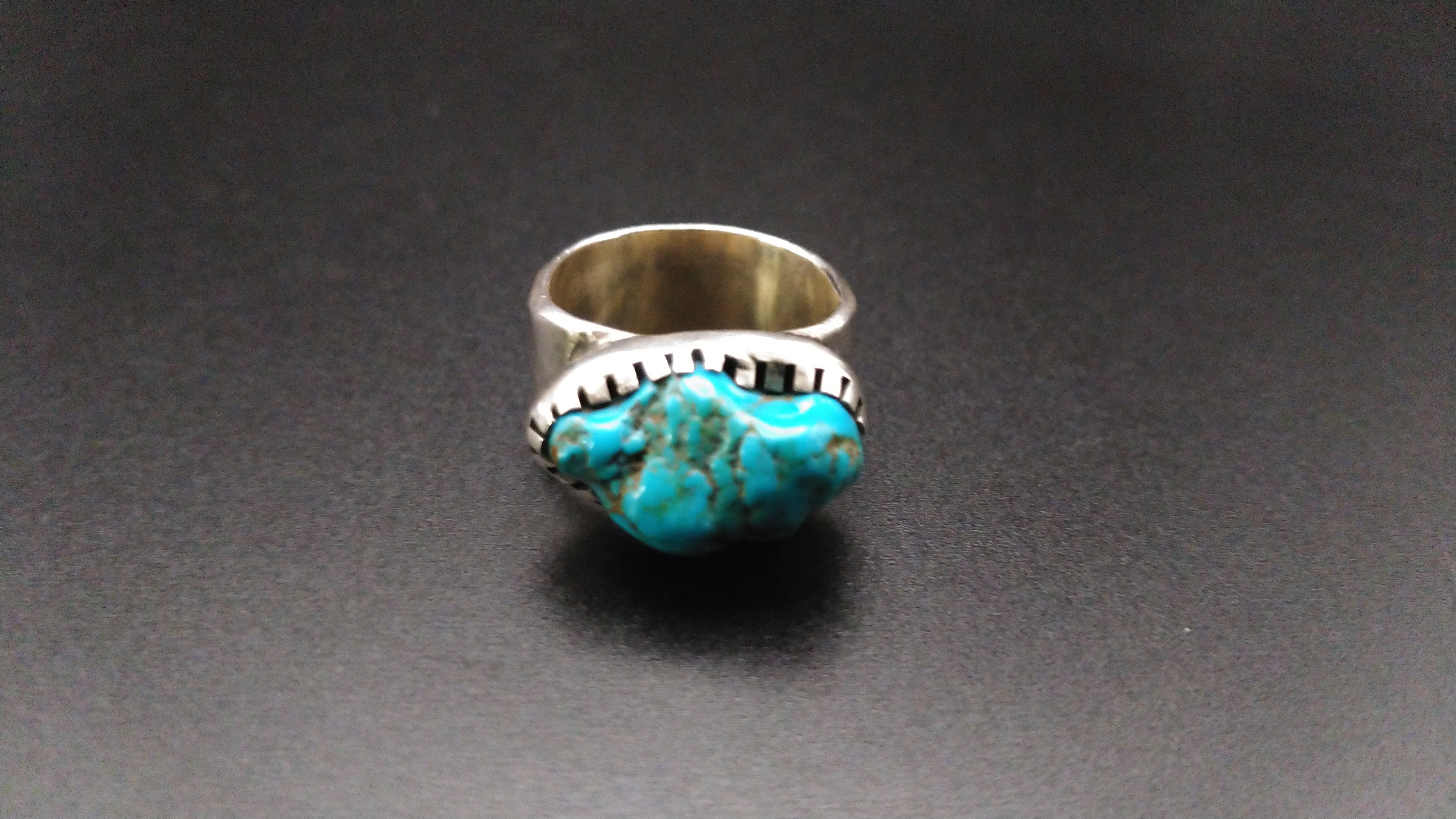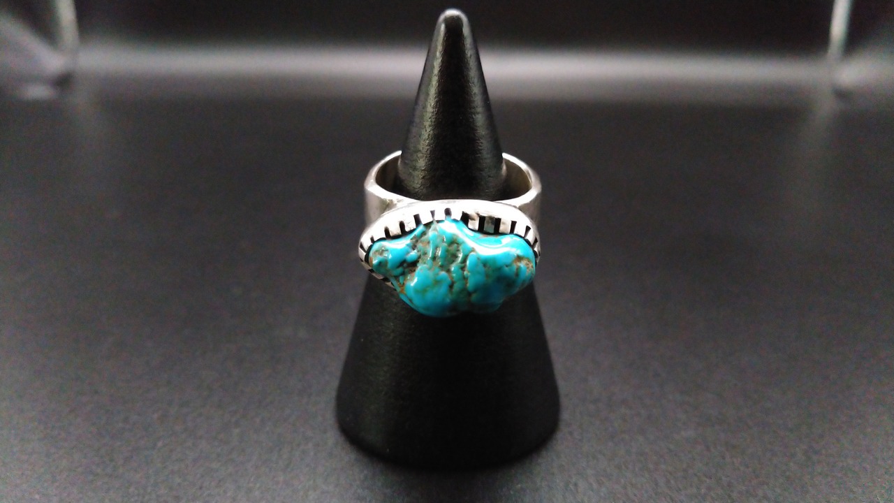 中央にはキングマンナゲットターコイズを埋め込み、存在感あるリングに仕上げています