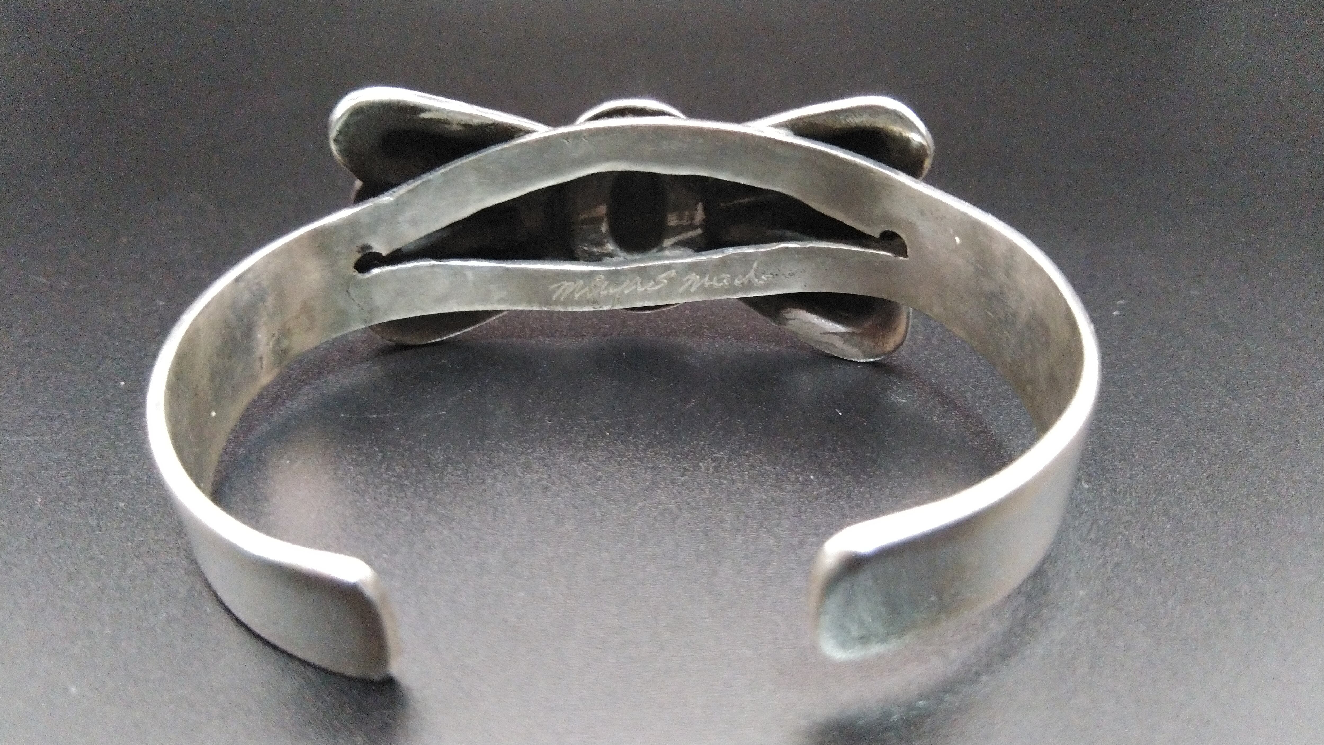 平打ちにて作成したバングルの中央部にリボンテクスチャコンチョとアポロコンチョをセットしました