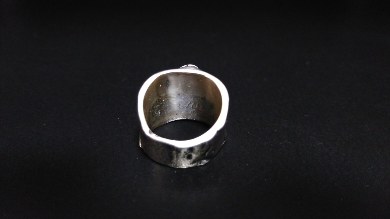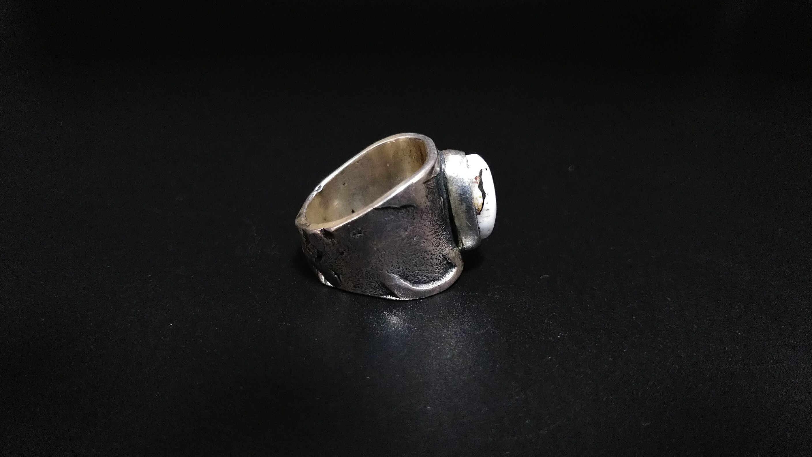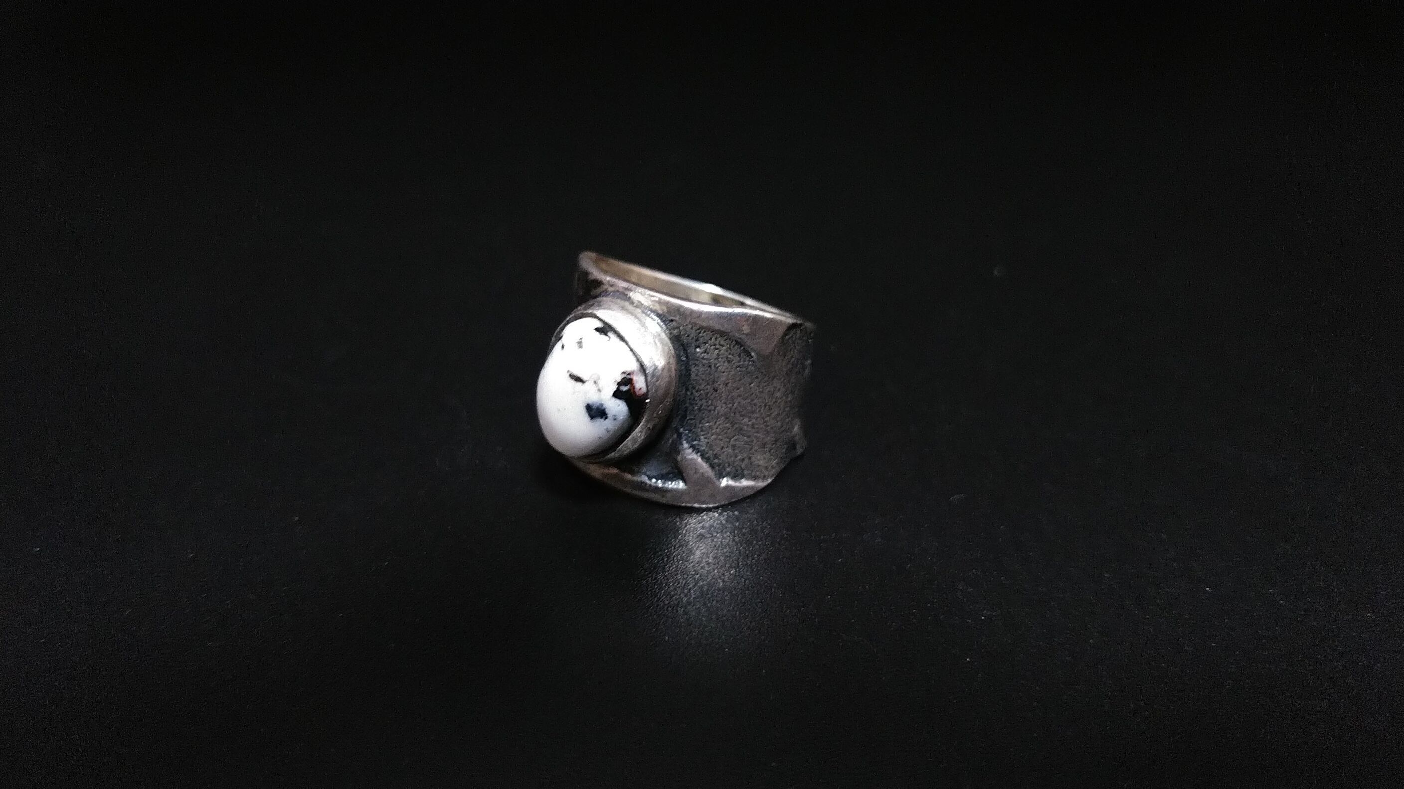 幻のターコイズと言われるホワイトバッファローターコイズを埋め込み、存在感のあるリングに仕上げました