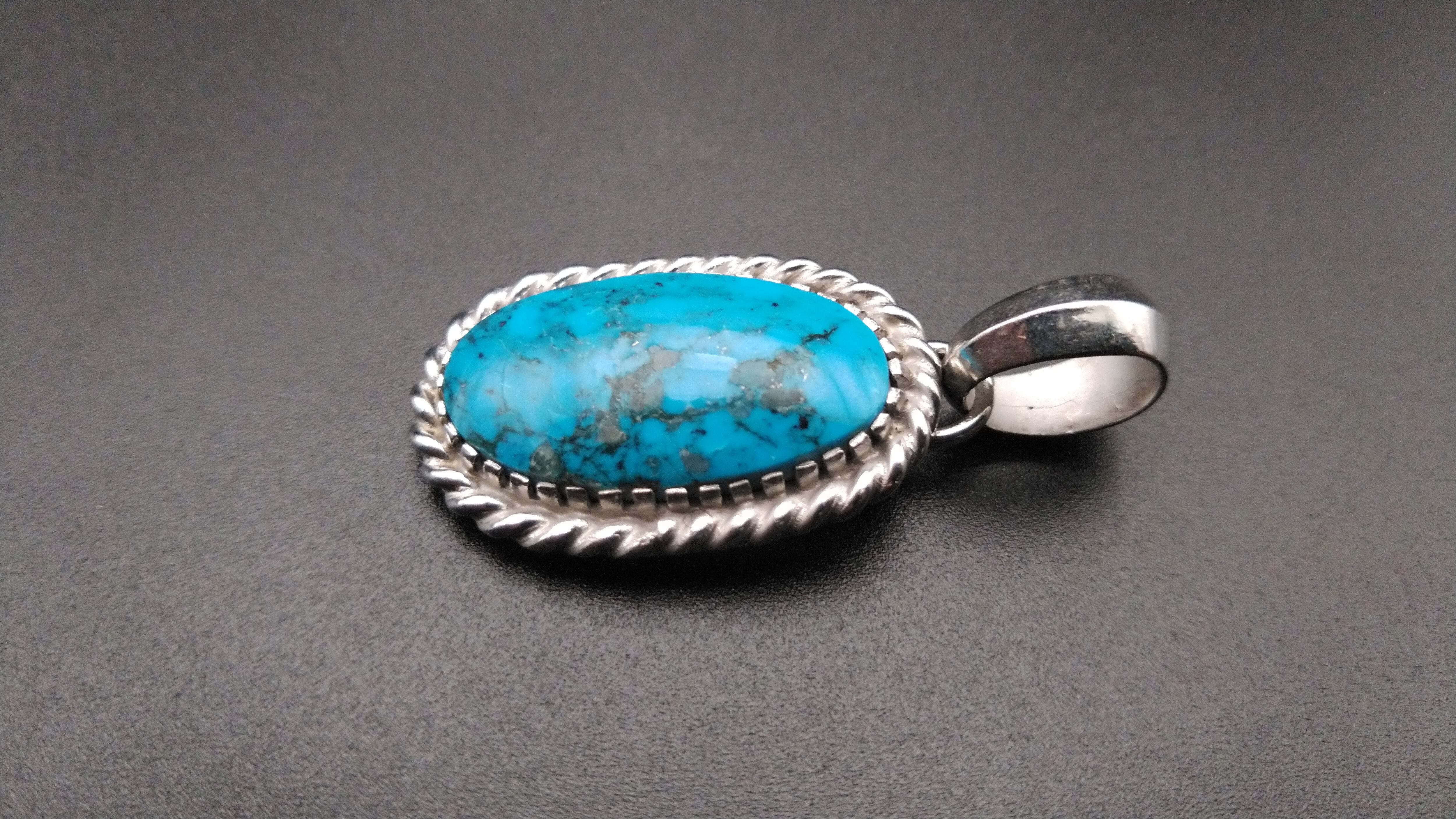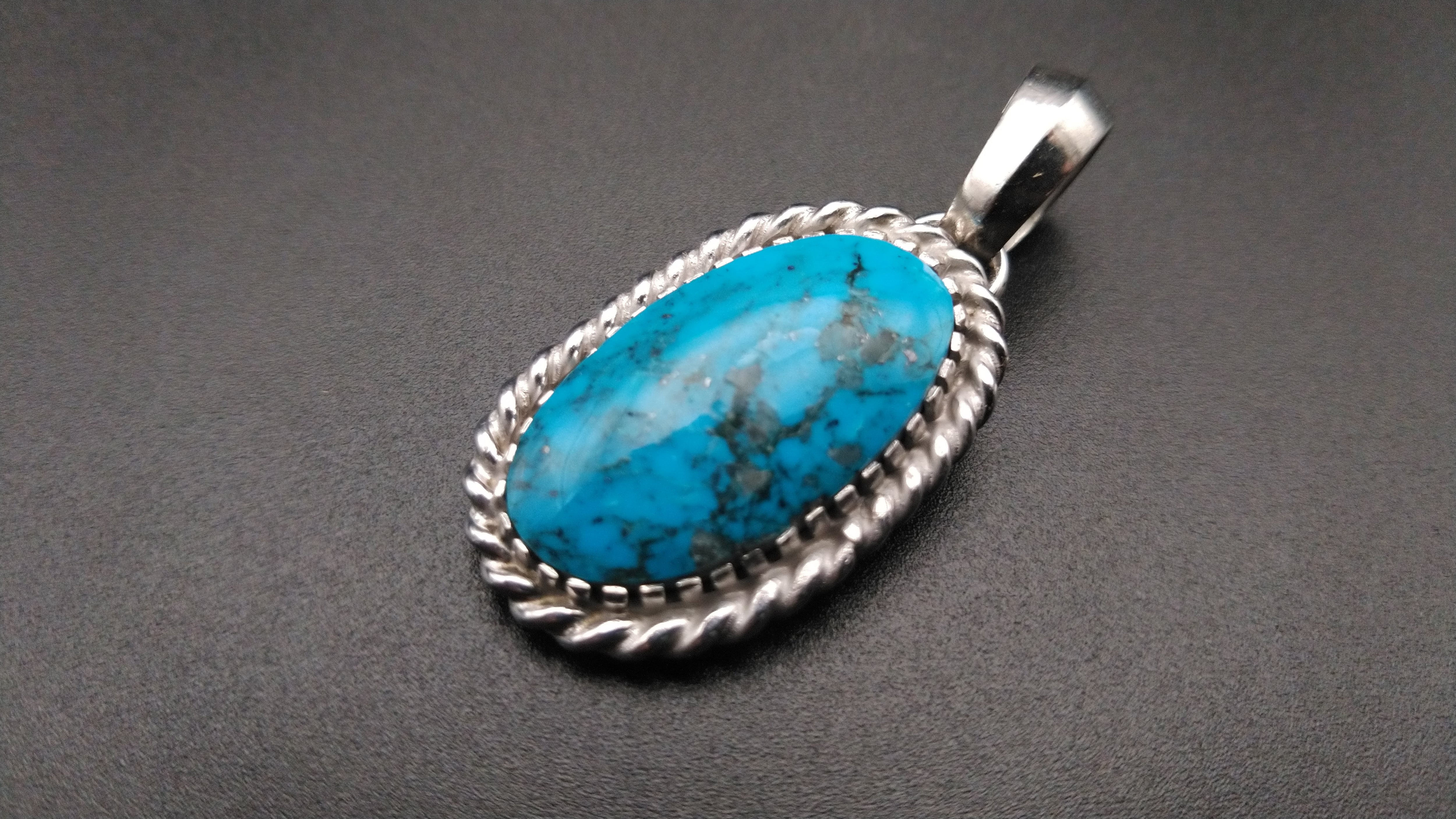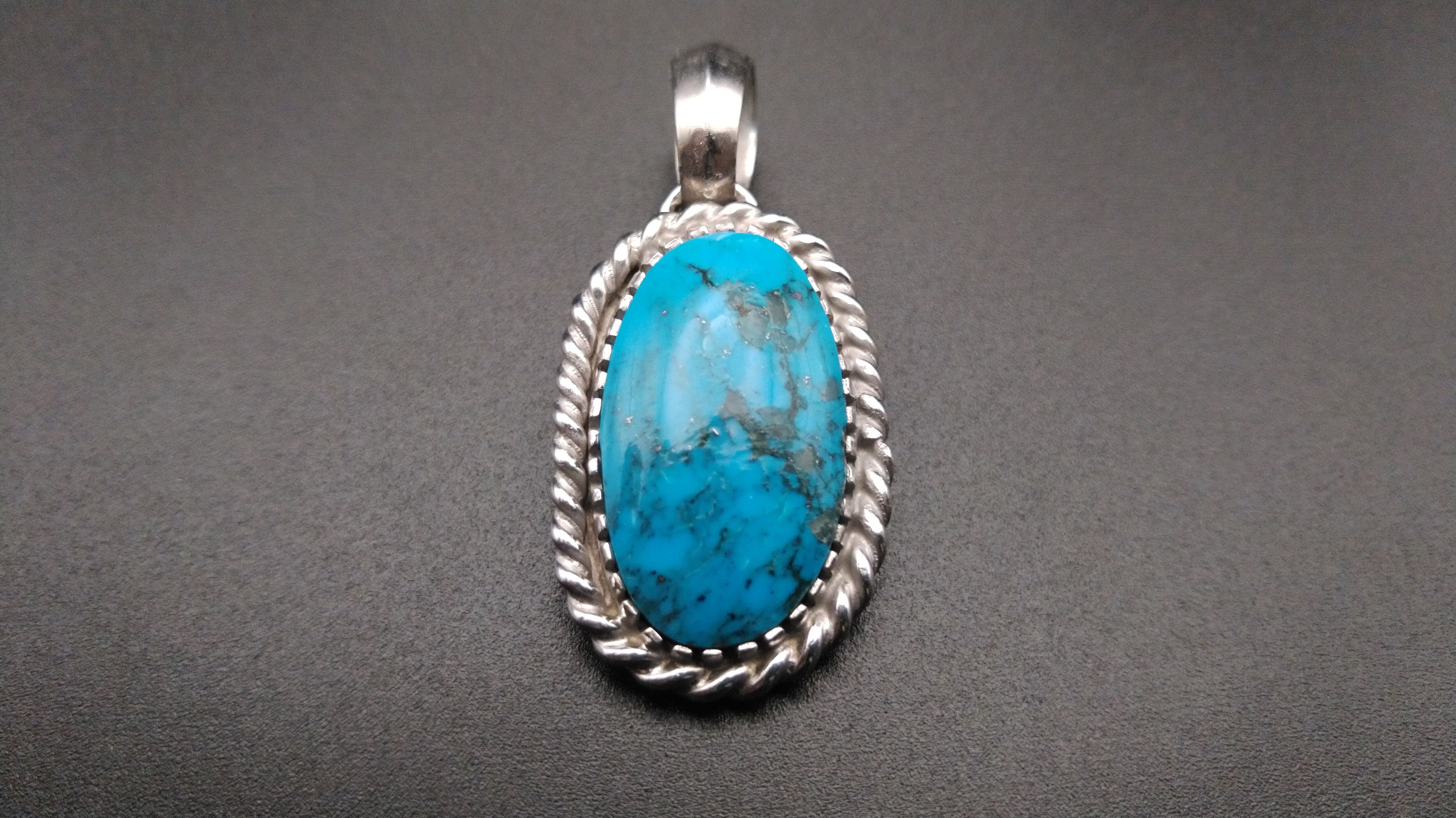 ハイグレードターコイズ特有の鮮やかな青とまだら模様がとても美しい作品となっています