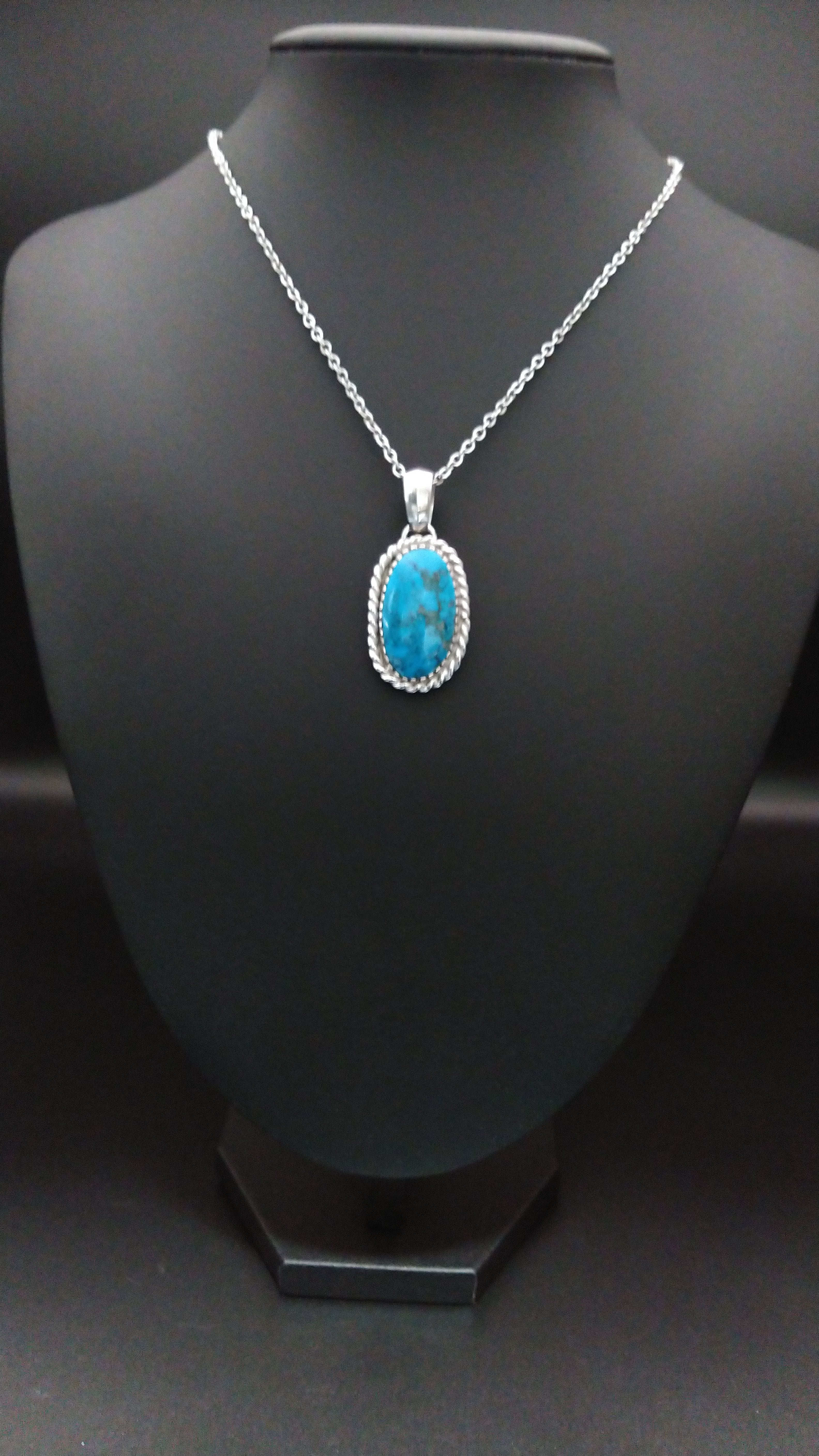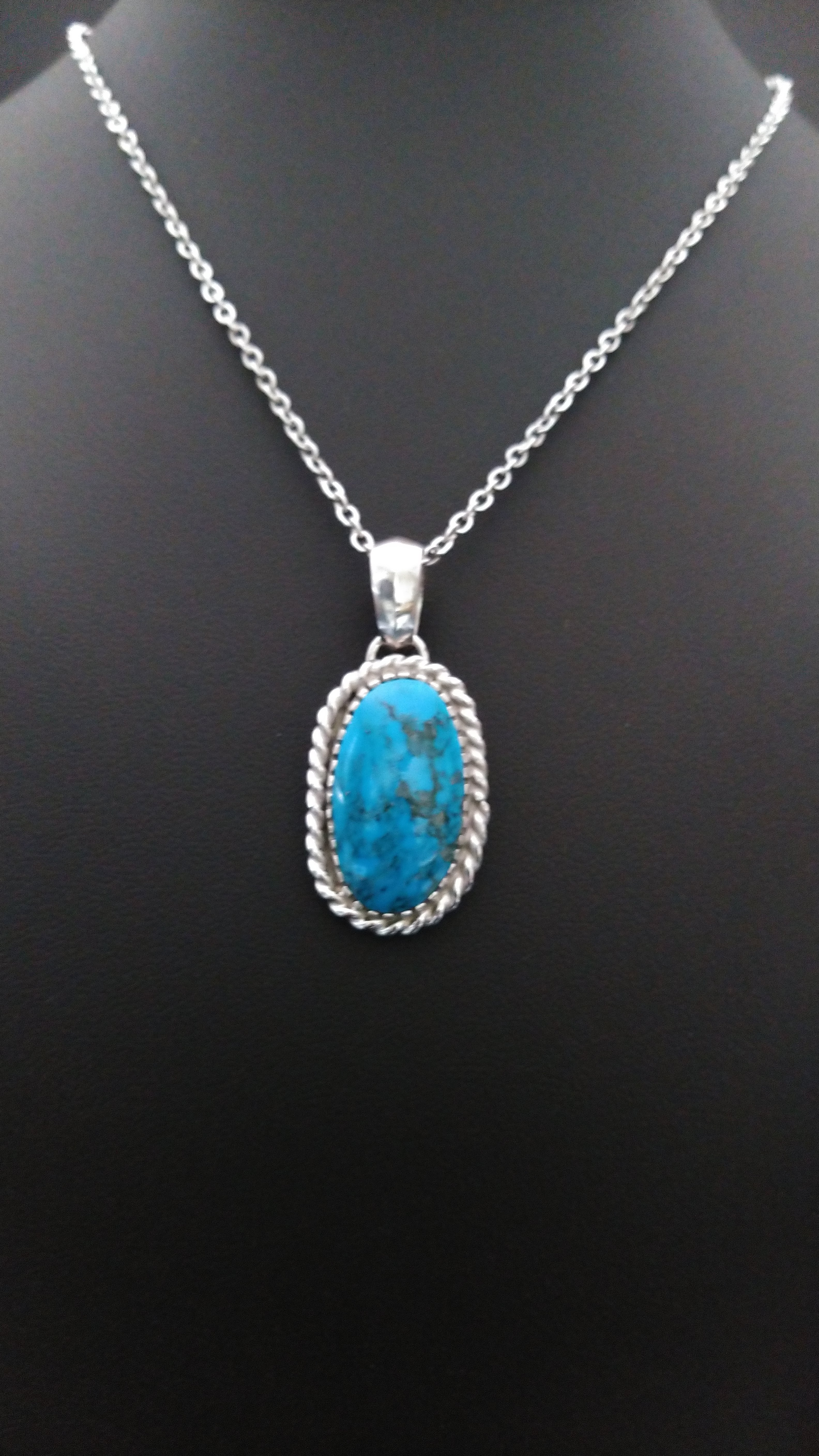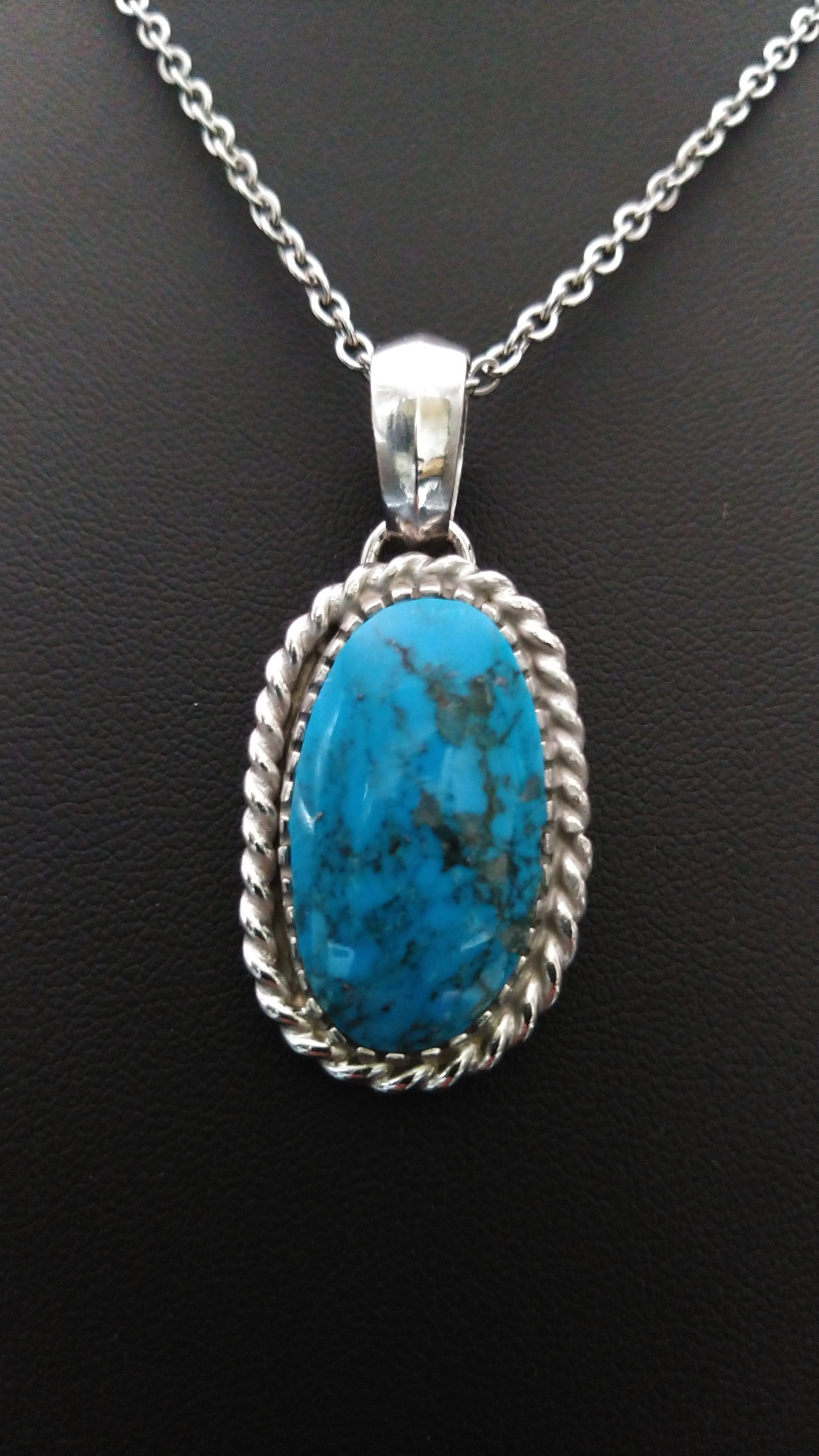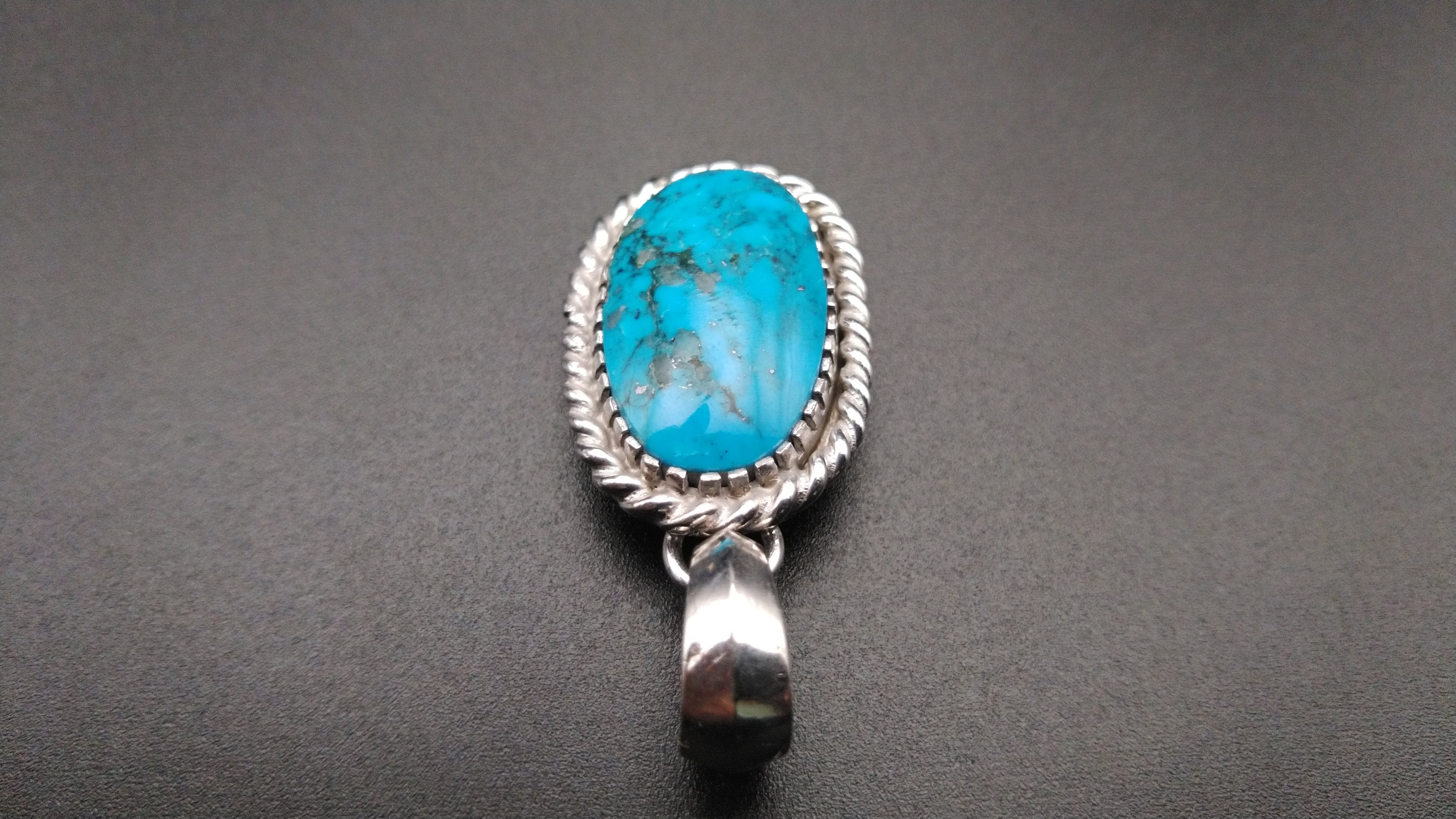 ハイグレードターコイズ特有の鮮やかな青とまだら模様がとても美しい作品となっています