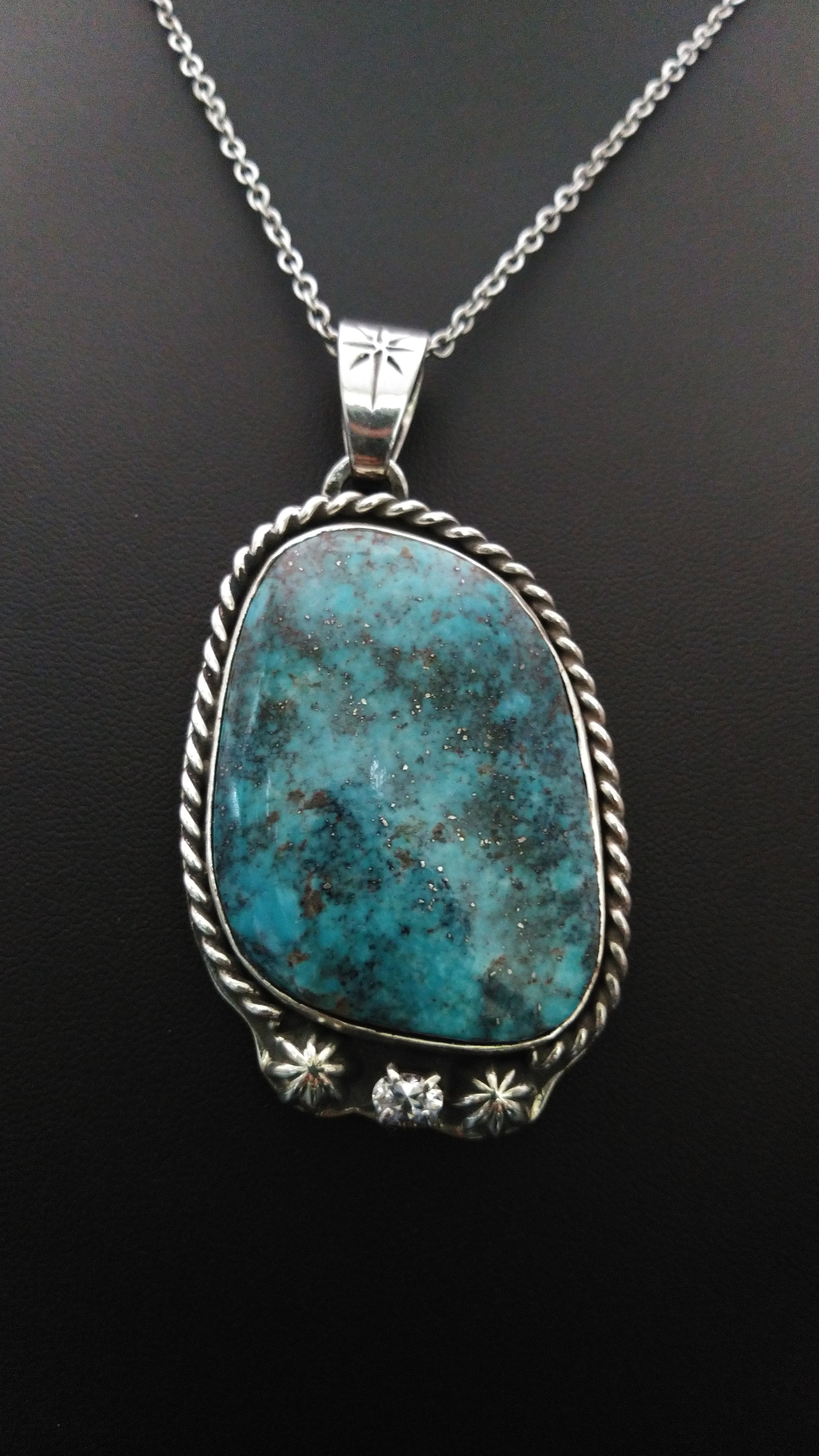 下部にはダイアモンドとアポロコンチョをあしらっており、ブルーダイヤモンドのまだら模様が美しい、非常にインパクトのある外観となっています