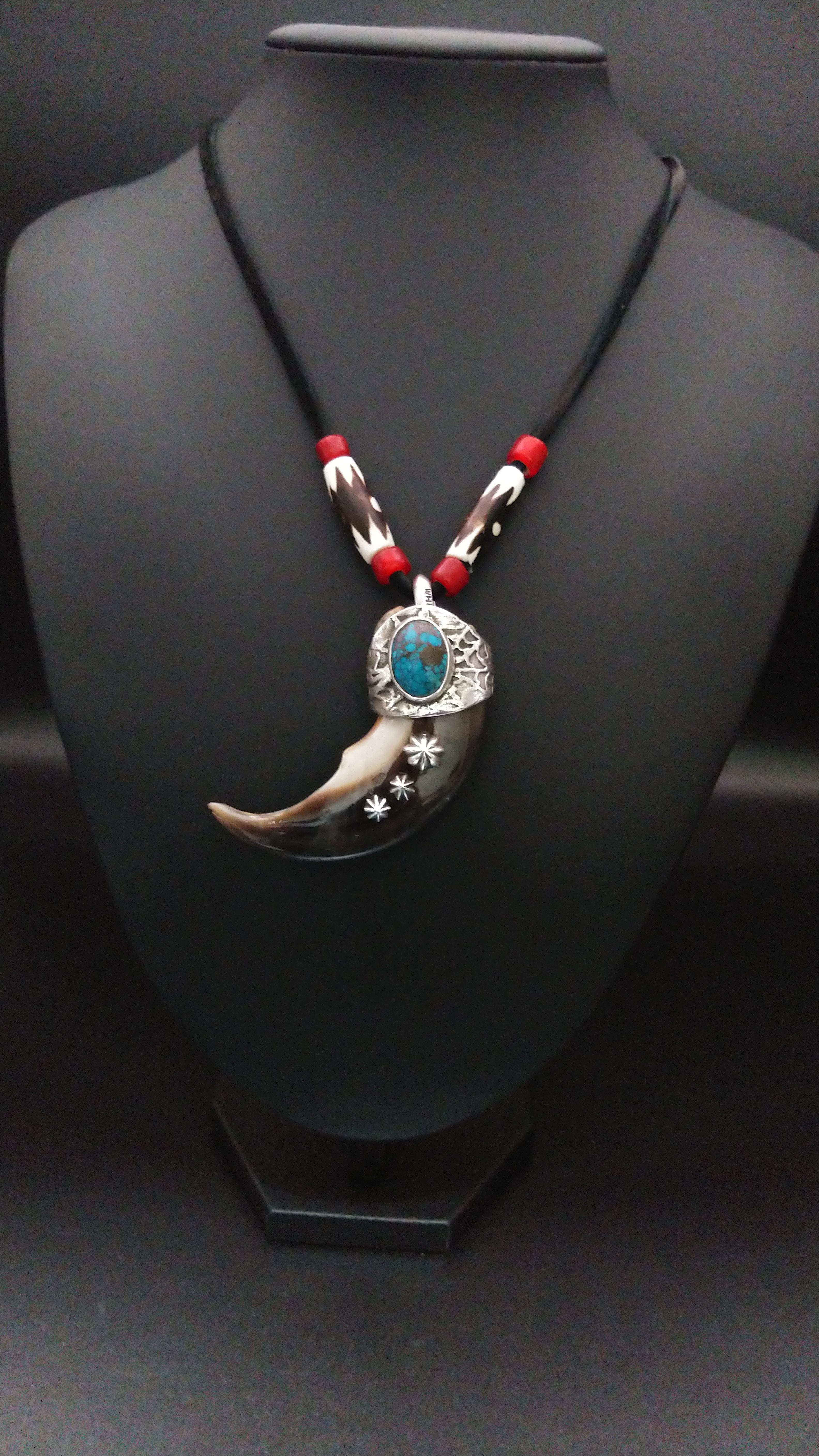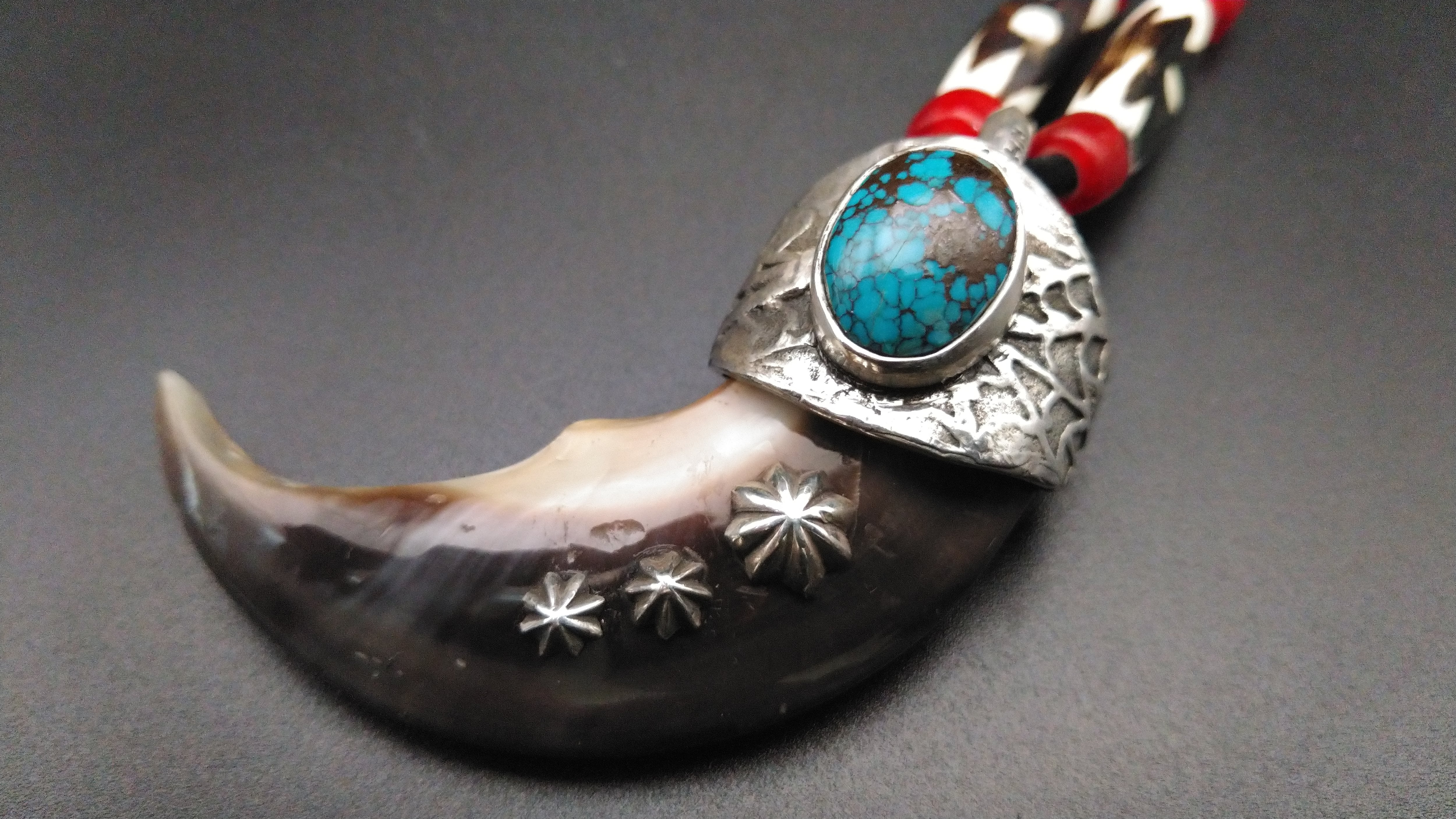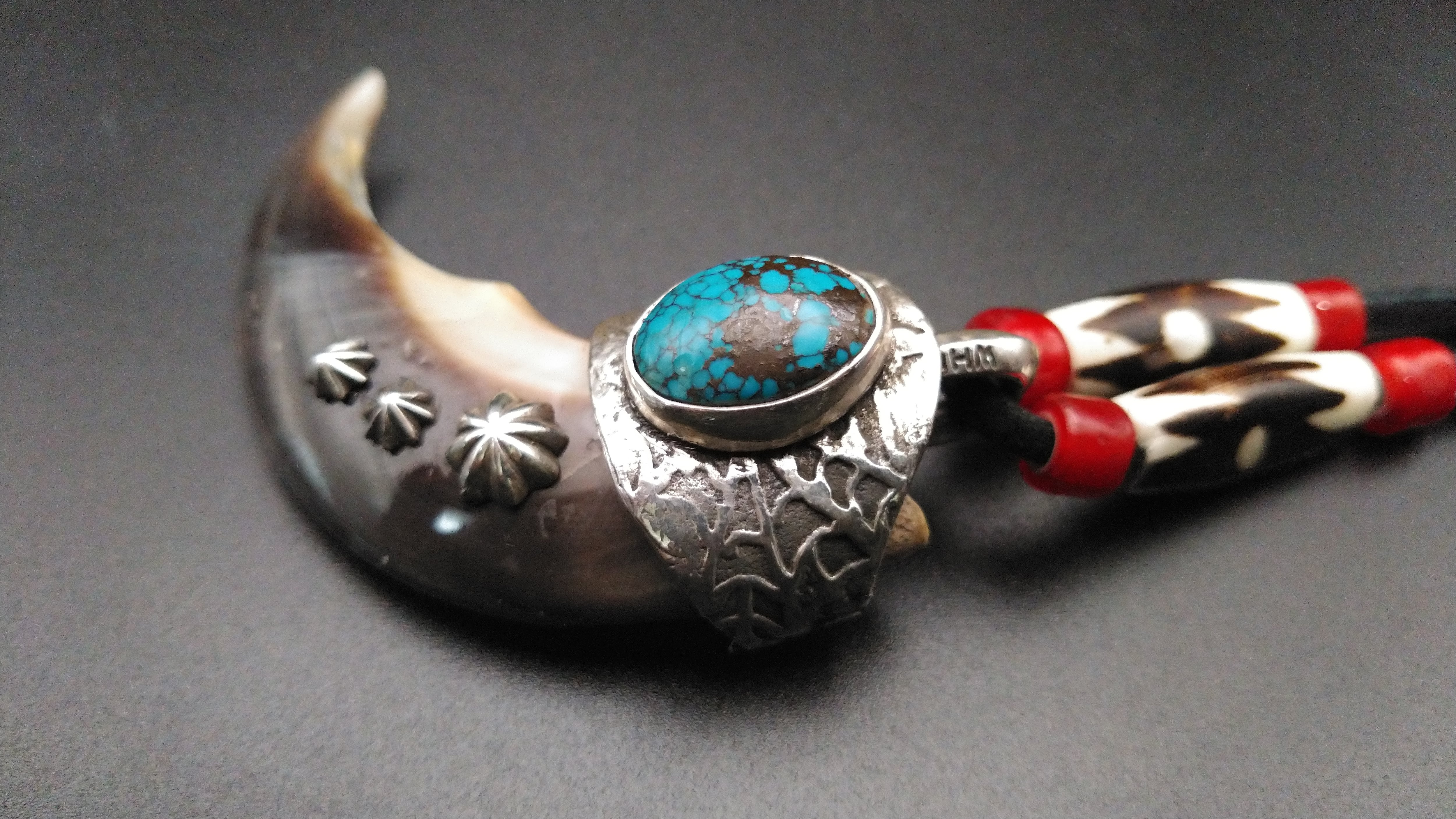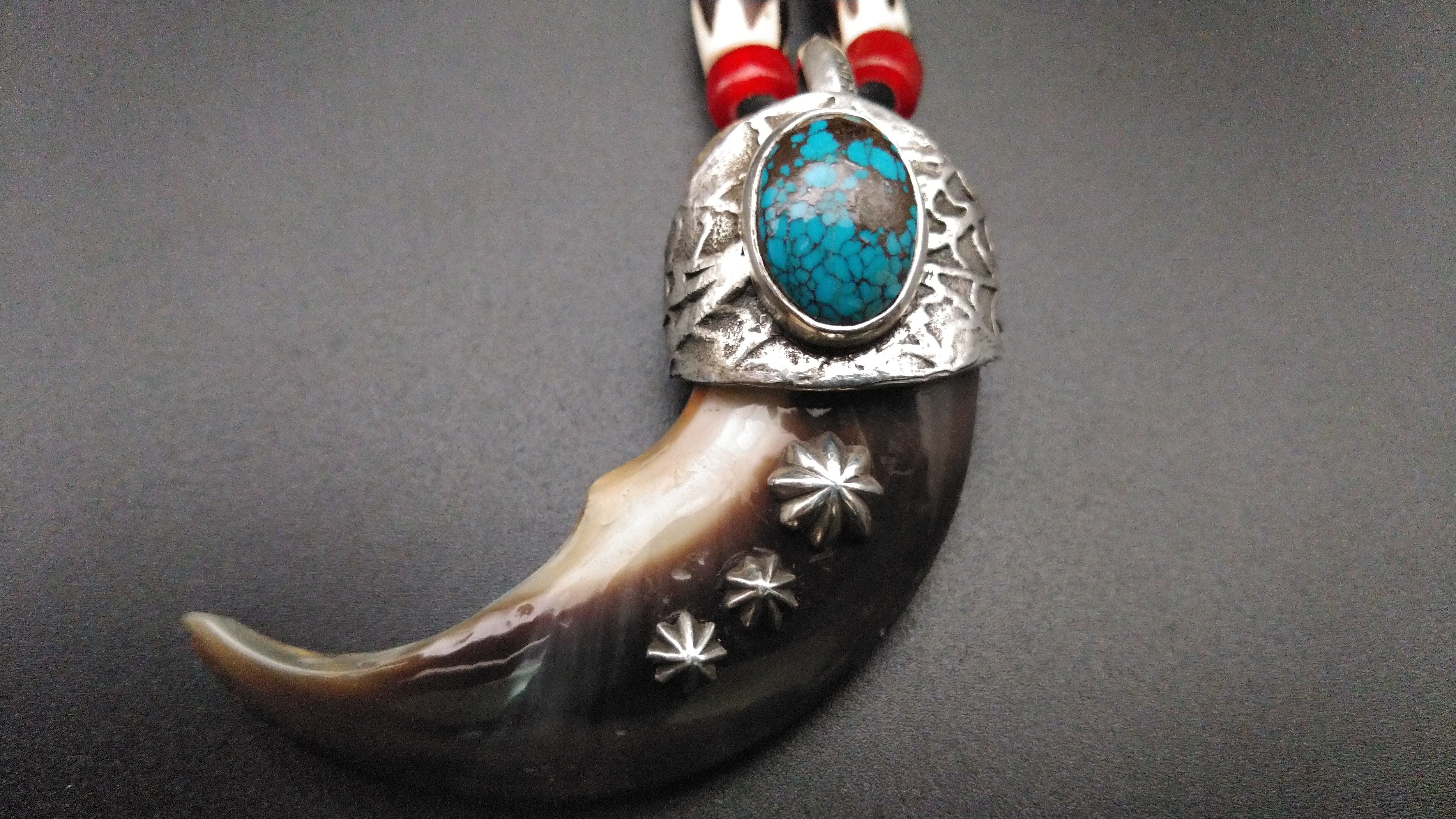 クマの爪特有の荒々しい雰囲気を残しつつ、上部にはハイグレードのキングマンターコイズ、爪にはアポロコンチョを3つ打ち込んでおり、非常にワイルドな外観となっております